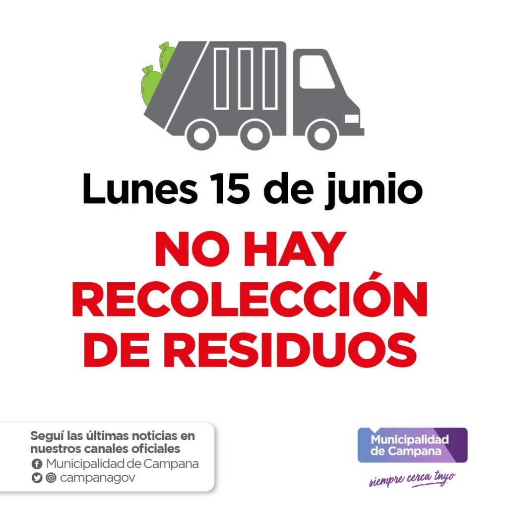 La Subdirección de Higiene Urbana del Municipio informa que el lunes 15 no habrá recolección de residuos dado el feriado nacional por el Paso a la Inmortalidad del General Martín Miguel de Güemes, que se conmemora el 17 de junio.