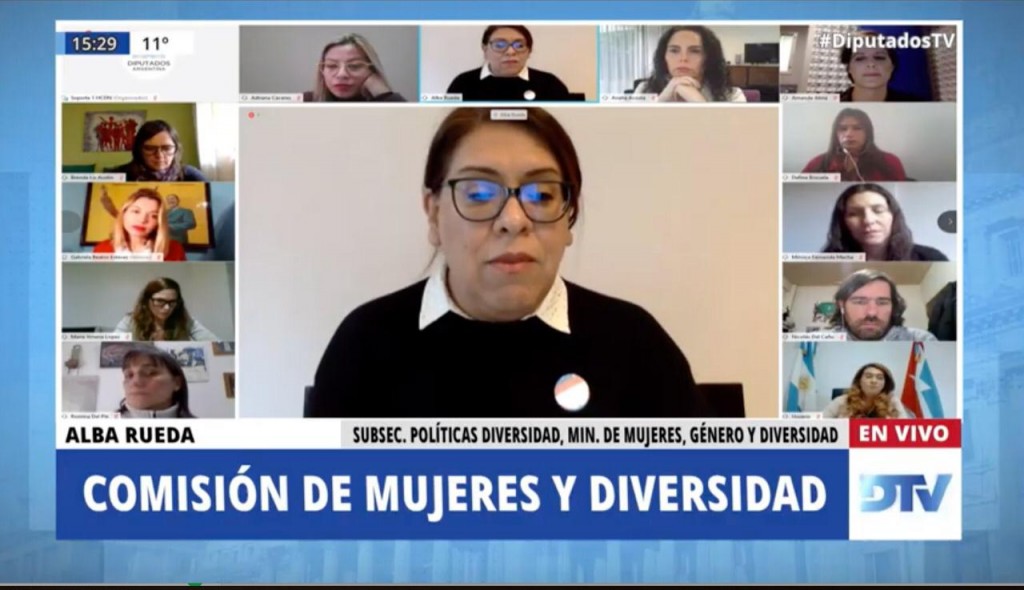 Alba Rueda, subsecretaría de Políticas de Diversidad del Ministerio de las Mujeres, Géneros y Diversidad de la Nación (MMGyD) participó de la reunión informativa de la Comisión de Mujeres y Diversidad de la Cámara de Diputados y Diputadas de la Nación en la que se están analizando los proyectos de Acceso Laboral de las personas travestis trans.
