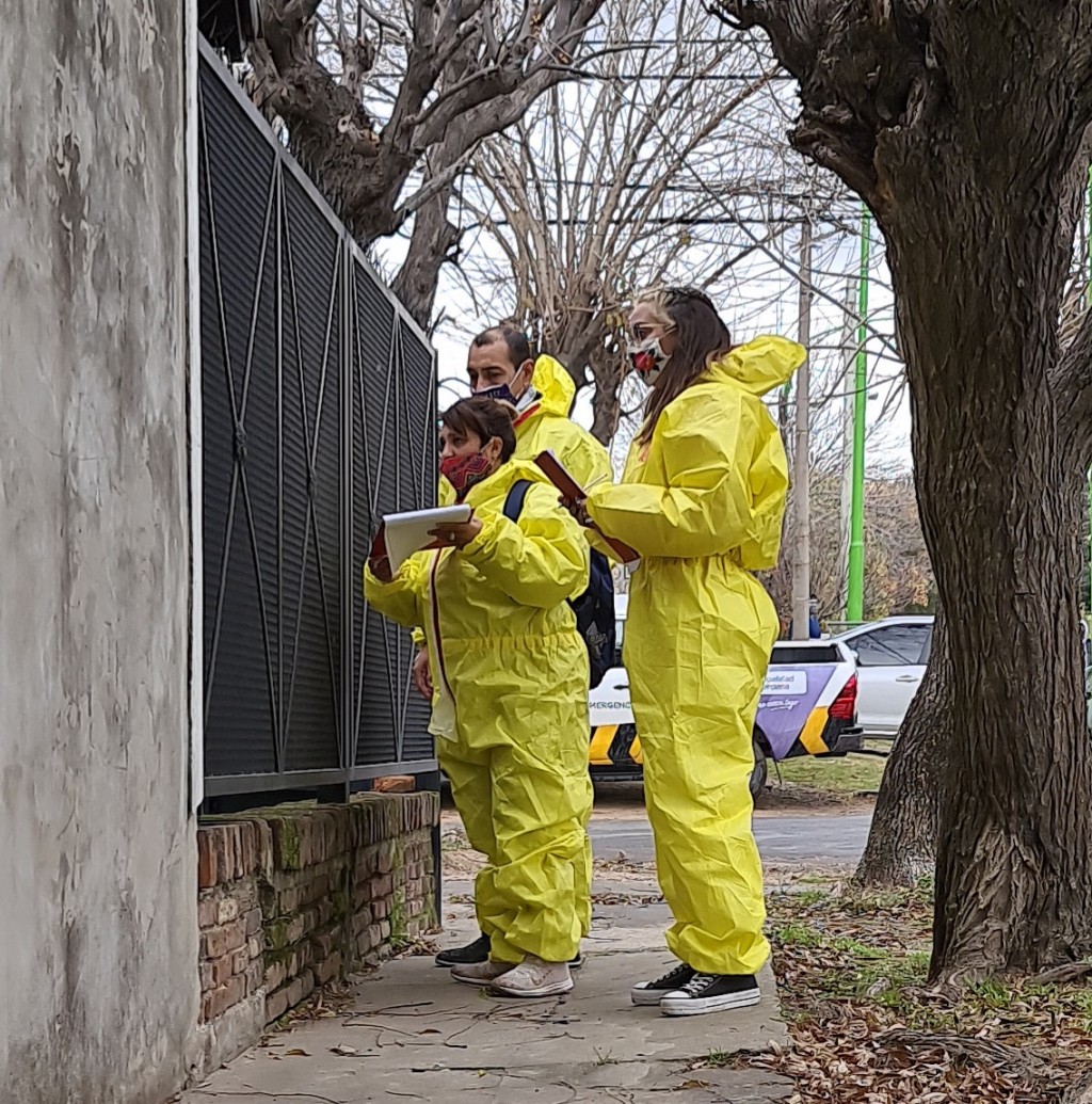 Utilizando trajes amarillos de protección personal, máscaras faciales y termómetros digitales, como así también respetando las medidas epidemiológicas, visitaron casa por casa tomando la fiebre de los vecinos, realizando encuestas sanitarias y entregando folletería informativa.