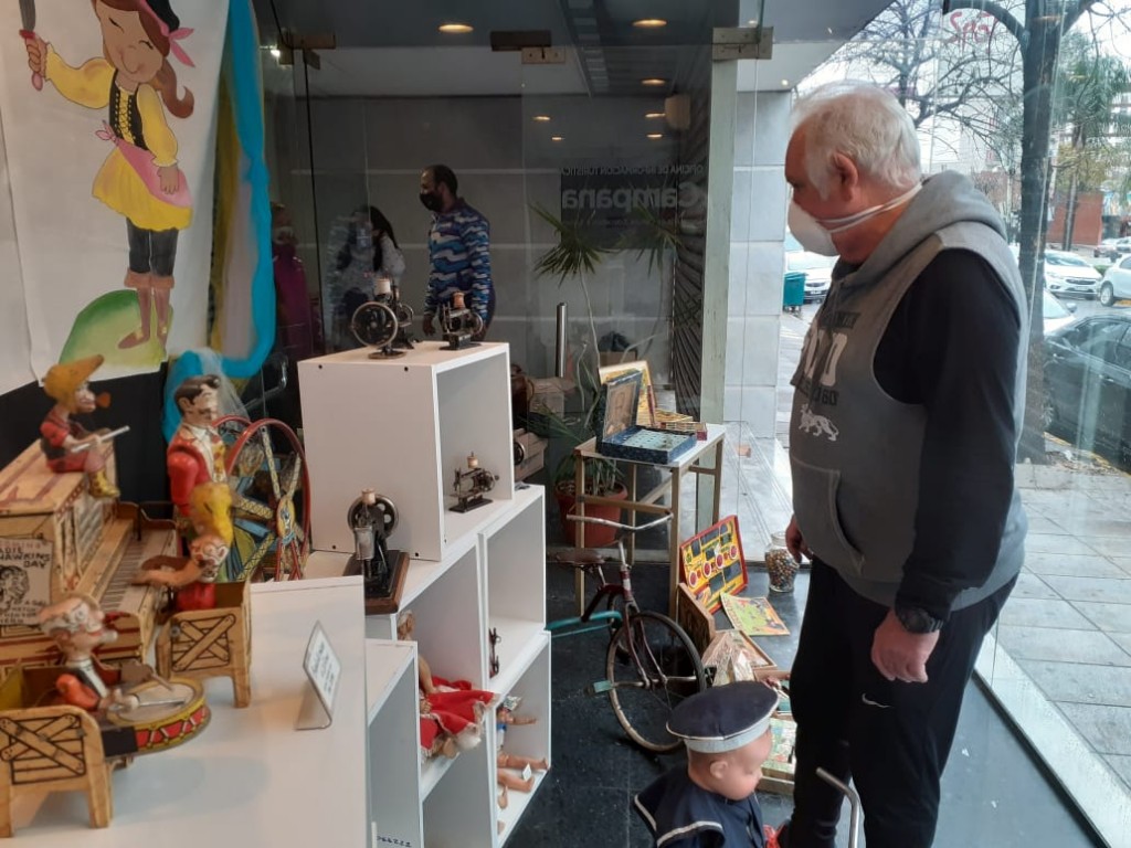 En la “pecera” del edificio, se pueden ver piezas pertenecientes a la colección privada del vecino Hugo Coletta. Son todos de hojalata, a cuerda, de arrastre y autómatas, los más antiguos de madera.