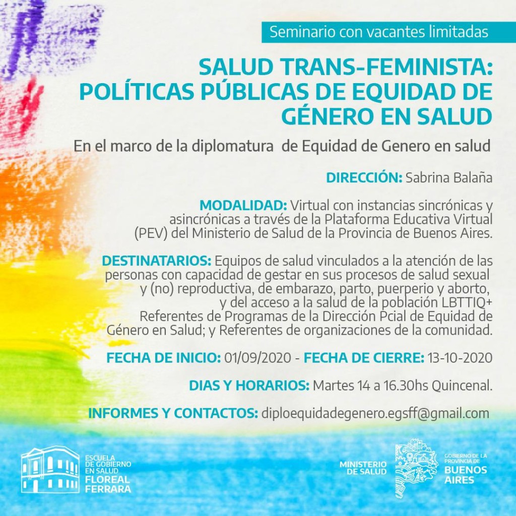 Se abrió la inscripción al Seminario "Salud Trans- Feminista: Políticas Públicas de Equidad de Género", en el marco de la Diplomatura de Equidad de Género en Salud. Para mayor información comunicarse a [email protected].