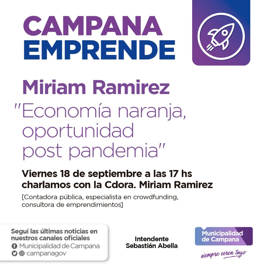 La disertación online, que estará a cargo de la contadora Miriam Ramírez, se transmitirá a través del canal de Youtube. Para ello, los interesados deberán ingresar a https://www.youtube.com/c/CampanaEmprende