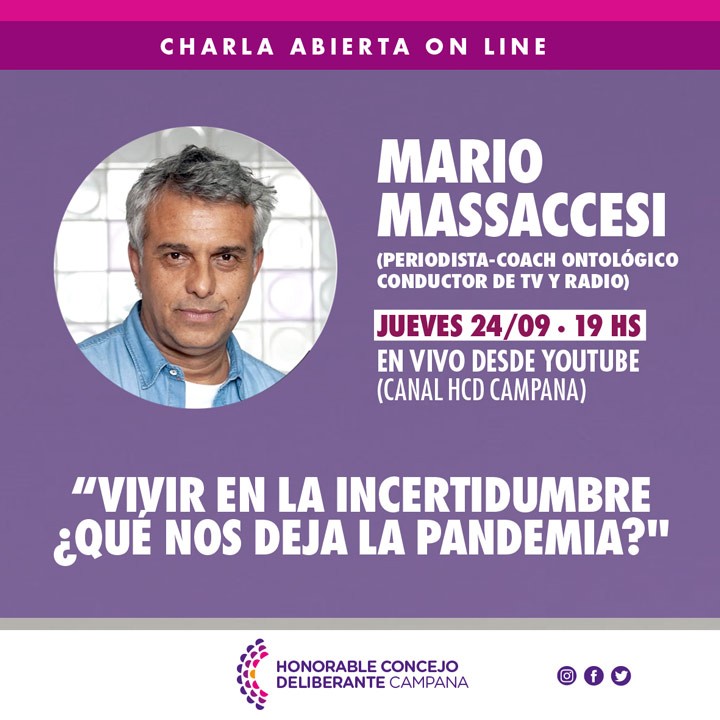 Con el nombre “Vivir en la incertidumbre: ¿Qué nos deja la pandemia?”, la presidenta del HCD, Marina Casaretto, junto al reconocido periodista, coach ontológico y conductor de televisión y radio, Mario Massaccesi, realizarán una actividad virtual.