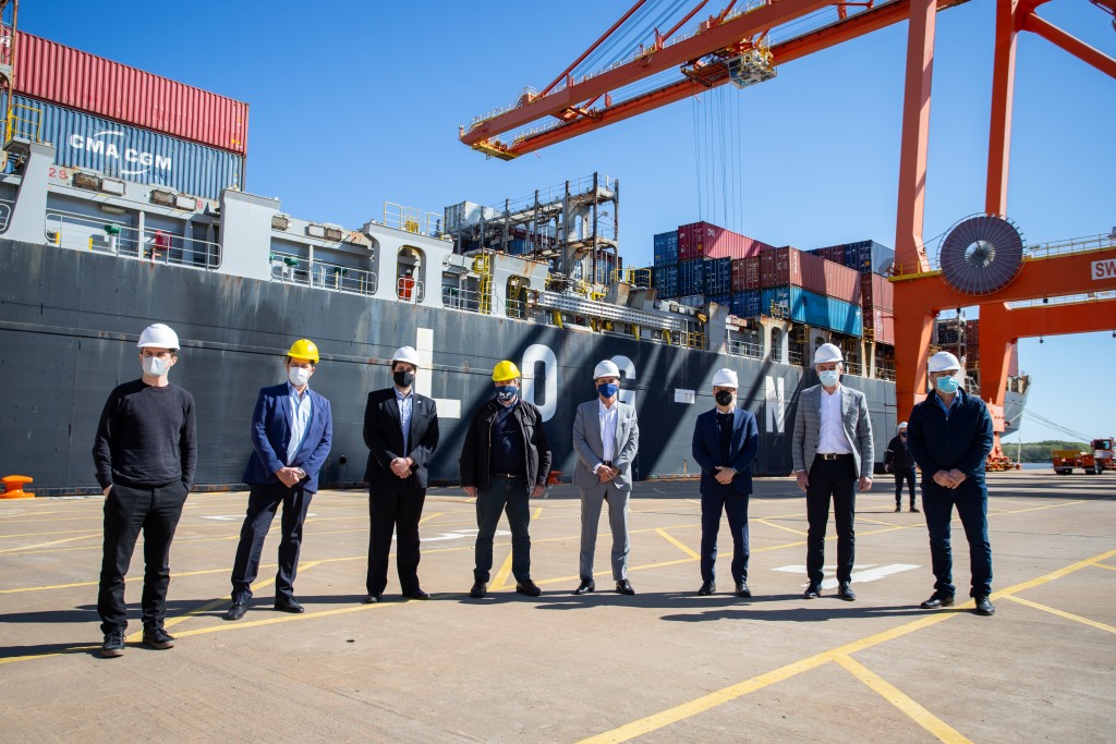 Estuvo acompañado por el intendente de Berisso, Fabián Cagliardi, el ministro de Producción, Ciencia e Innovación Tecnológica, Augusto Costa, y el presidente de la empresa operadora de la terminal de contenedores TecPlata, Bruno Porchietto.