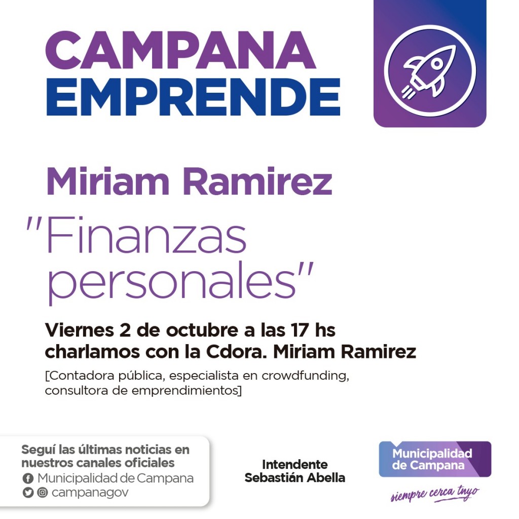 Desde las 17, Miriam Ramírez desarrollará una capacitación sobre finanzas personales y objetivos de corto, mediano y largo plazo, en el canal de Youtube Campana Emprende.