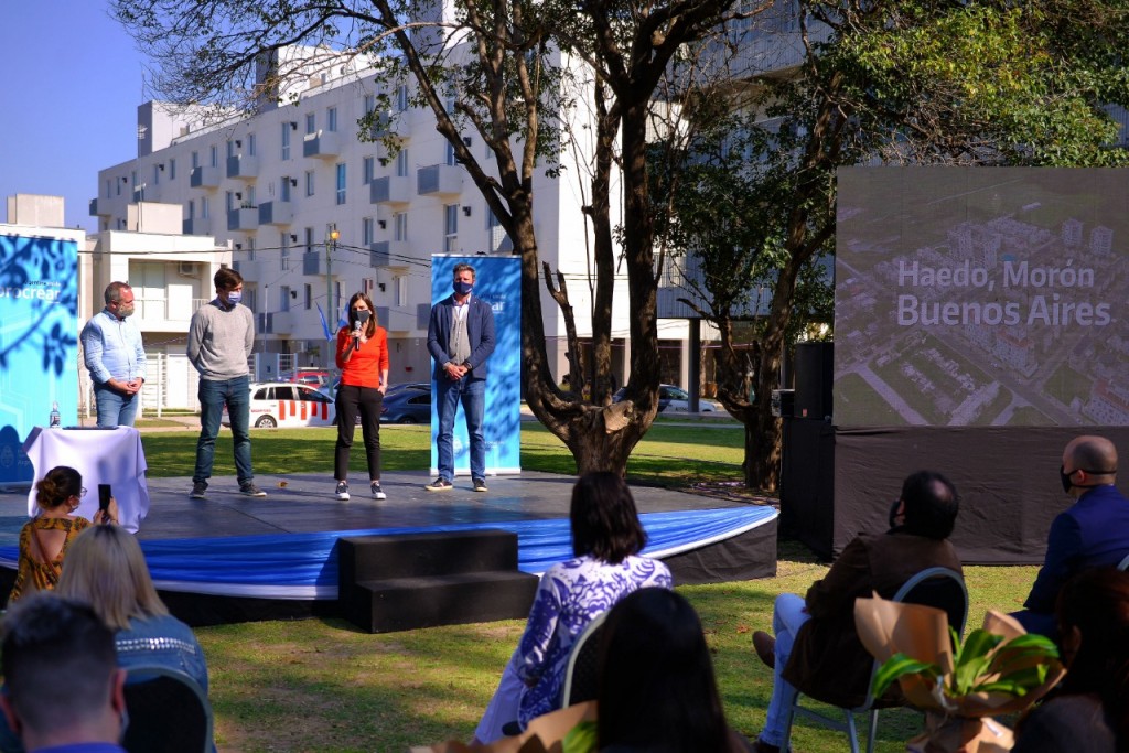El acto se realizó con las mayores medidas de seguridad sanitaria y contó con la presencia de la directora de la ANSES, Fernanda Raverta —quien forma parte del Comité que encabeza la ministra de Desarrollo Territorial y Hábitat, María Eugenia Bielsa—; del subsecretario de Política de Suelo y Urbanismo, Luciano Scatolini; y del intendente de Morón, Lucas Ghi.