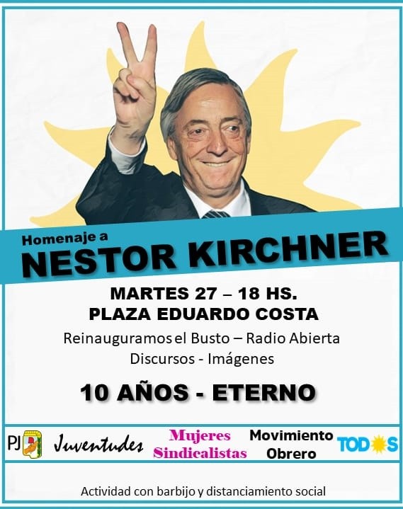 "Todos los años celebramos a Néstor. Esta vez se cumplen 10 años de su fallecimiento y nos toca hacerlo en un contexto de pandemia impensado para todos. Su figura es símbolo de que podemos salir adelante, porque él puso de pie la Argentina una vez y con su ejemplo lo vamos a volver a hacer" expresó la Presidenta del bloque de Concejales del Pj-Frente de Todos, Sol Calle, quien aclaró que quienes participen de la actividad deberán contar con barbijo, y respetar el distanciamiento social junto a todas las medidas de cuidado en el marco de la pandemia por el COVID-19.