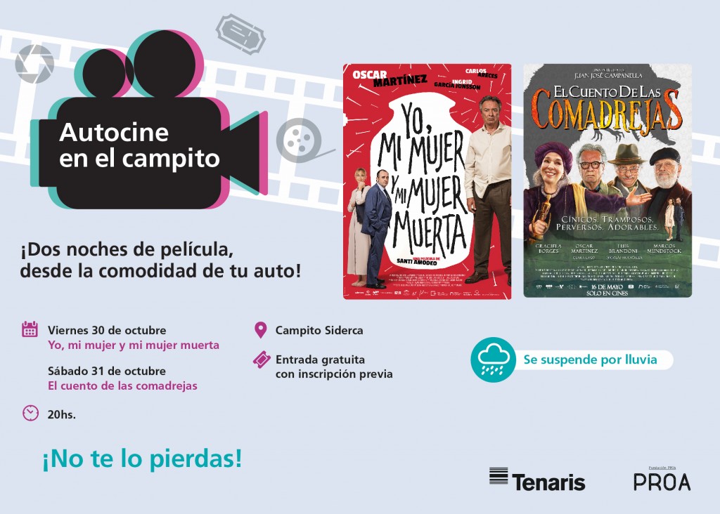 Será solo en modalidad autocine debido al protocolo COVID vigente. La tradicional propuesta cultural proyectará en el Campito de Siderca las películas “Yo, mi mujer y mi mujer muerta”, de Santiago Amodeo, y “El cuento de las comadrejas”, dirigida por Juan José Campanella. Las funciones serán el viernes 30 y sábado 31 de octubre. Se requiere inscripción previa.