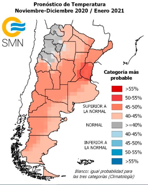 El pronóstico de temperaturas, para el trimestre nov-dic.ene 2020/2021, indica que en las provincias de La Rioja, Catamarca, Tucumán, Jujuy y el este de Salta es más probable que las temperaturas medias registren valores normales para la época, mientras que para el resto del país es más probable tener un trimestre con temperaturas superiores a las normales. Se destaca el oeste patagónico, la región de Cuyo y el Litoral con probabilidades de media a alta (45-55%) de esta tendencia.