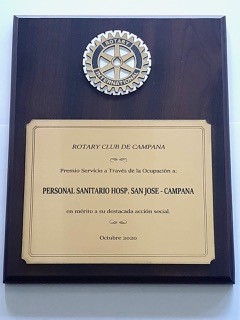 Este jueves 29 de Octubre Rotary Club Campana procedió a entregar los Reconocimientos SATO 2020(Servicio a Través de la Ocupación), durante el transcurso de una reunión virtual que tuvo una nutridaconcurrencia.En esta oportunidad fueron homenajeados con esta distinción, la Sra. Carla Rodríguez y el PersonalSanitario del Hospital Municipal San José de Campana.