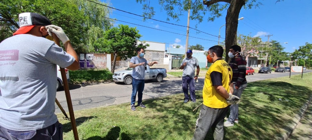 En esta ocasión, se acercó a las avenidas Ameghino y Perón, donde se efectuaban tareas de limpieza y corte de pasto sobre los canteros centrales.