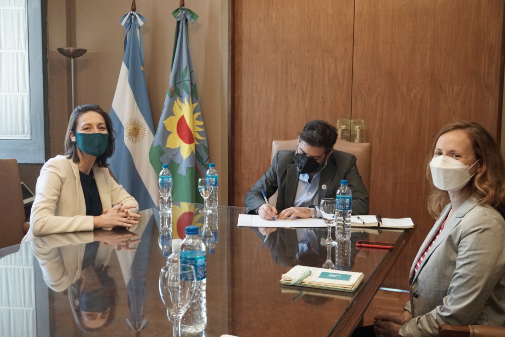 La Provincia de Buenos Aires recibió una donación de insumos médicos de parte de la Unión Europea, a través de la Organización Internacional para las Migraciones (OIM), que serán destinados a hospitales de cuatro municipios. El jefe de Gabinete, Carlos Bianco, recibió a la embajadora de la Unión Europea en Argentina, Aude Maio-Coliche, y a la jefa de oficina de Organización Internacional para las Migraciones (OIM) en Argentina, Gabriela Fernández, para firmar el acuerdo de donación, en un encuentro del que también participó Sofía Sternberg, subsecretaria de Relaciones Internacionales e Institucionales de la Jefatura de Gabinete, el área cuya gestión hizo posible que se concretara la iniciativa.