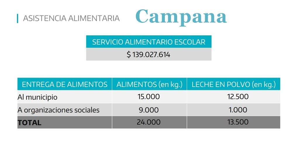 Además de la fuerte inversión en el SAE, programa dirigido a niños y adolescentes en situación de vulnerabilidad social, escolarizados en escuelas públicas de la provincia de Buenos Aires, con el objetivo de garantizar una cobertura nutricional uniforme asistiendo particularmente a los más vulnerables a través de la realización del desayuno o merienda y almuerzo, en los distintos comedores escolares de Campana, también se entregaron 24.000 kilos de alimentos y 13.500 kilos de leche en polvo, recibidas tanto por el Municipio como por organizaciones sociales.