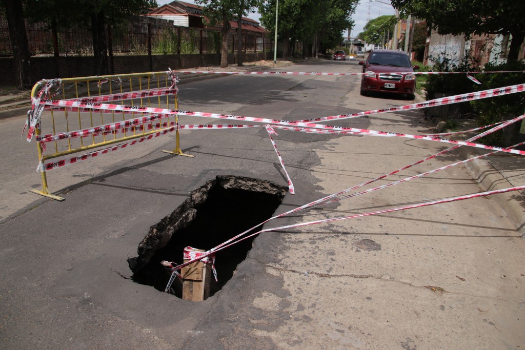 Luego de que se produjera un importante daño en la calzada a raíz de una pérdida de agua, se restringe temporalmente la circulación vehicular. El Municipio y la empresa ABSA coordinan la reparación.