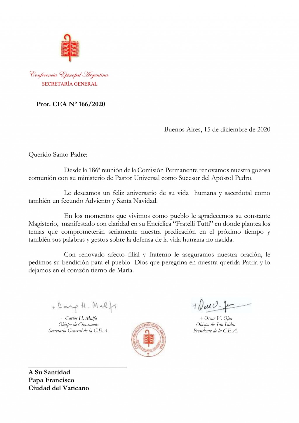 Durante el transcurso de esta jornada se envió una carta al Santo Padre Francisco renovando la comunión con el sucesor del Apóstol Pedro, saludándolo con motivo del aniversario de su ordenación sacerdotal. Los Obispos agradecieron al Papa su magisterio, manifestado con claridad en la encíclica Fratelli tutti y sus palabras y gestos en defensa de la vida humana no nacida.
