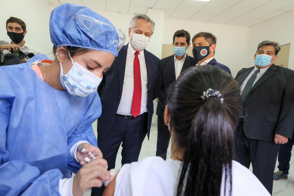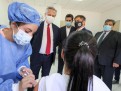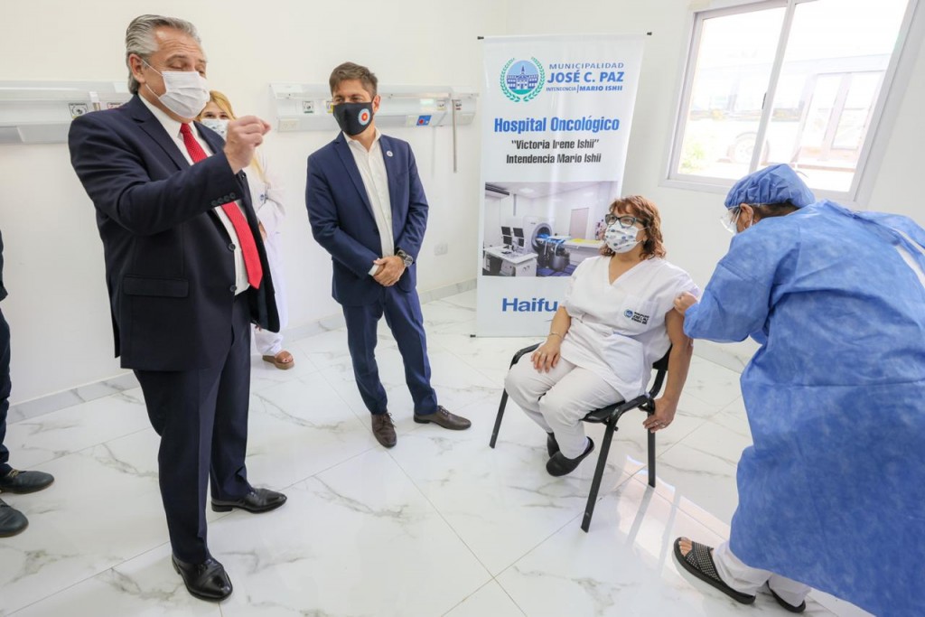 El presidente Alberto Fernández recorrió el Hospital Oncológico de José C. Paz, junto al gobernador de la provincia de Buenos Aires, Axel Kicillof; el ministro del Interior, Eduardo De Pedro y el intendente local, Mario Ishii, supervisando el plan de vacunación contra el Covid-19.