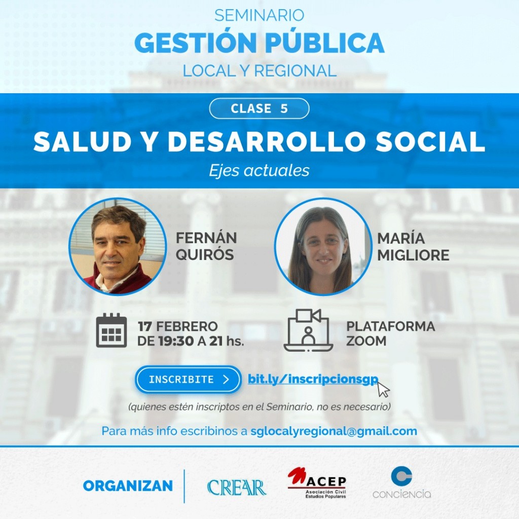 Focalizado en los ejes de Salud y Desarrollo Social, mañana miércoles 17 de febrero a las 19.30 se realizará la quinta clase virtual del "Seminario de Gestión Pública Local y Regional". La actividad reunirá a dos importantes referentes de esas áreas, Fernán Quirós, Ministro de Salud de la Ciudad de Buenos Aires, y María Migliore, Ministra de Desarrollo Humano y Hábitat de la Ciudad de Buenos Aires. La propuesta formativa para dirigentes es abierta y gratuita, organizada por ACEP, CREAR y la Fundación Conciencia y es dirigida por los senadores provinciales Roberto Costa y Lucas Fiorini.