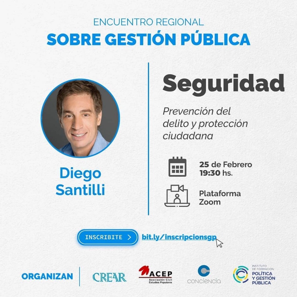 Este jueves 25 de febrero a las 19.30 se realizará un nuevo encuentro regional de formación para dirigentes de la Provincia de Buenos Aires que contará con la participación de Diego Santilli, vicejefe de la Ciudad de Buenos Aires. La actividad focalizará en el ámbito de la seguridad, prevención del delito y protección ciudadana y se realizará en el marco del "Seminario de Gestión Pública Local y Regional" que es organizado por ACEP, CREAR y la Fundación Conciencia y dirigida por los senadores provinciales Lucas Fiorini y Roberto Costa.