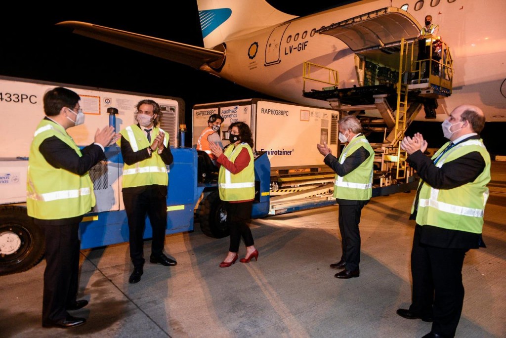 La recepción de las dosis, que llegaron en un Airbus 330-200 equipado con contenedores especiales con control activo de temperatura, estuvo a cargo, por parte del Gobierno, del jefe de Gabinete, Santiago Cafiero; la ministra de Salud, Carla Vizzotti, y el canciller Felipe Solá. Además, estuvieron presentes el presidente de Aerolíneas Argentinas, Pablo Ceriani, y el embajador de China en el país, Zou Xiaoli.