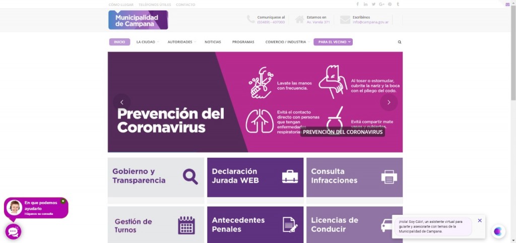 El sitio https://www.campana.gov.ar/ dispone de un asistente virtual – CAVI- que contesta automáticamente de manera ágil y sencilla las consultas que realizan los vecinos