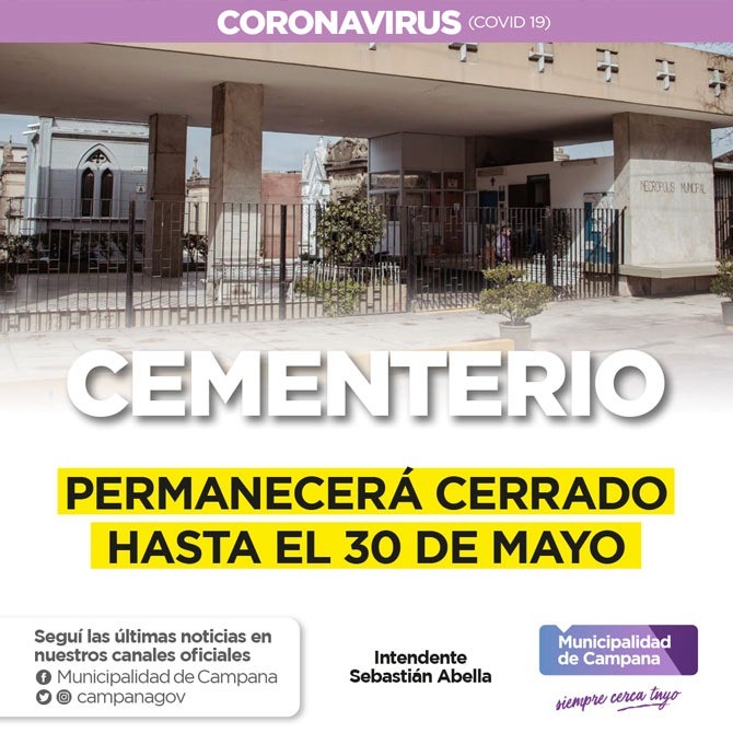 A raíz del confinamiento anunciado por el Gobierno Nacional, el Municipio informa que no se permitirán visitas. Solo continuará habilitado el servicio de sepelio.