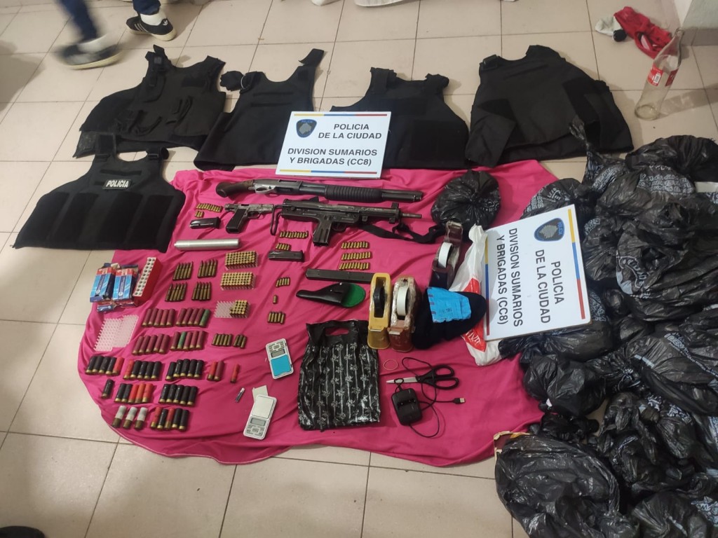 Mientras que en una casa ubicada en la platea 11, a unos 50 metros de la avenida Castañares los policías decomisaron 3.584 dosis de marihuana, 1.442 flores de marihuana, cuatro chalecos antibalas, una escopeta 12.70, una pistola ametralladora FMK3 calibre 9x19, una pistola Browning calibre 9x19, un silenciador, dos cargadores de pistola, un cargador de FMK3, 222 cartuchos de distintos calibre, 20, cartuchos calibre 308, 58 cartuchos de escopeta y un pasamontañas.