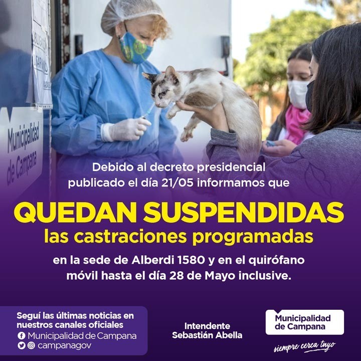 La suspensión de las castraciones gratuitas a perros y gatos se extenderá hasta el 28 de mayo inclusive, en concordancia con los anuncios realizados por el Gobierno nacional para bajar la cantidad de contagios de Covid-19.