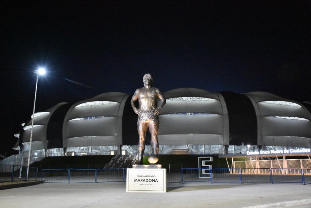 Ya los futbolistas argentinos habían descendido del micro que los trasladaba al estadio para descubrir una estatua de Maradona de grandes dimensiones y luego los homenajes siguieron en el magnífico estadio santiagueño.