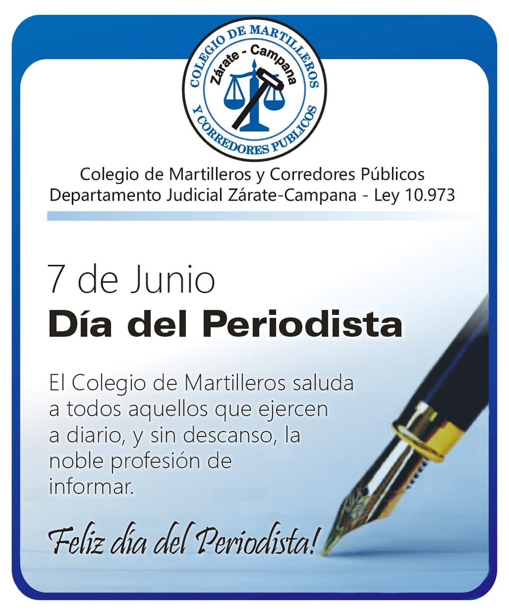 Ricardo querido feliz día del periodista Te deseo un gran día Gracias x tu acompañamiento siempre. Carlos Terragno Presidente del Colegio de Martilleros y Corredores Pùblicos del Departamento Judicial Zàrate-Campana.