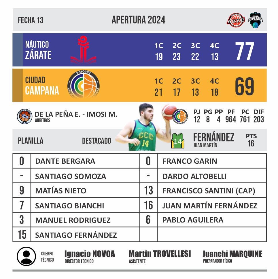 Los parciales fueron: 19-21/23-17/22-13/13-18. El goleador de Ciudad de Campana fue Juan Martín Fernández con 16, Santiago Fernández 15 y Francisco Santini 13.