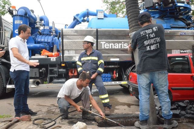 Tras limpiar las bocas de tormenta de la calle Chacabuco en Villanueva y otras de Lubo, Del Pino y Siderca, el camión desobstructor trabaja desde este jueves en distintos puntos críticos del centro de la ciudad.