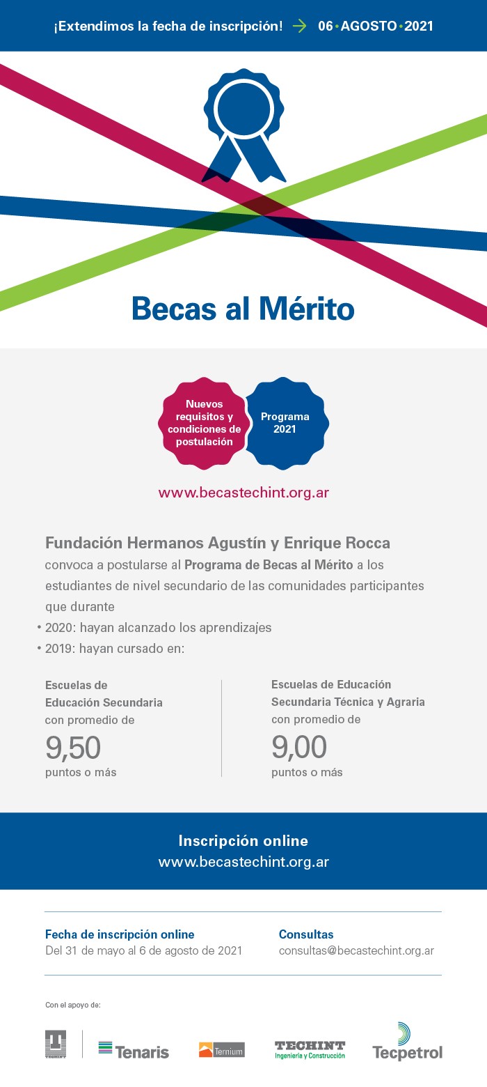 Los interesados tendrán tiempo hasta este viernes 06 de agosto. Las Becas al Mérito son una iniciativa de la Fundación Hermanos Agustín y Enrique Rocca y Tenaris que reconoce el esfuerzo y el compromiso de los jóvenes con la educación desde hace más de 50 años.