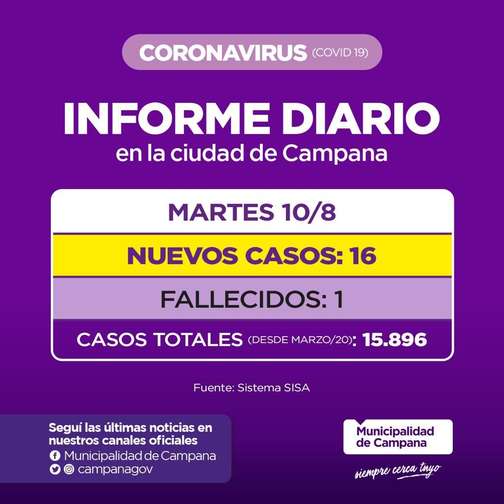 En el día de hoy se confirmaron 16 casos positivos y un fallecimiento. El fallecido es un hombre de 71 años que estaba internado en el Sanatorio Vandor.
