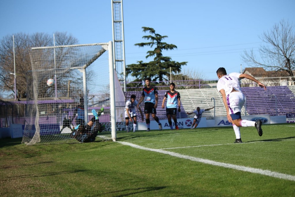 Bajo la lluvia, en un campo que aguantó bien las condiciones climáticas el "violeta" volvió a ganar como visitante con un gol de Cristian Broggi de penal en la parte final del juego.Se lo empataron a Villa Dálmine en el final