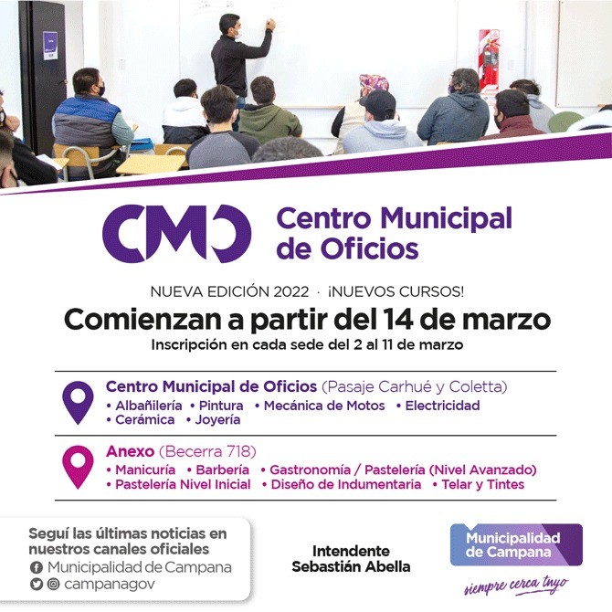 Del 2 al 11 de marzo se realizará la inscripción a los cursos del Centro Municipal de Oficios, informaron desde la Secretaría de Inclusión, Educación y Cultura.