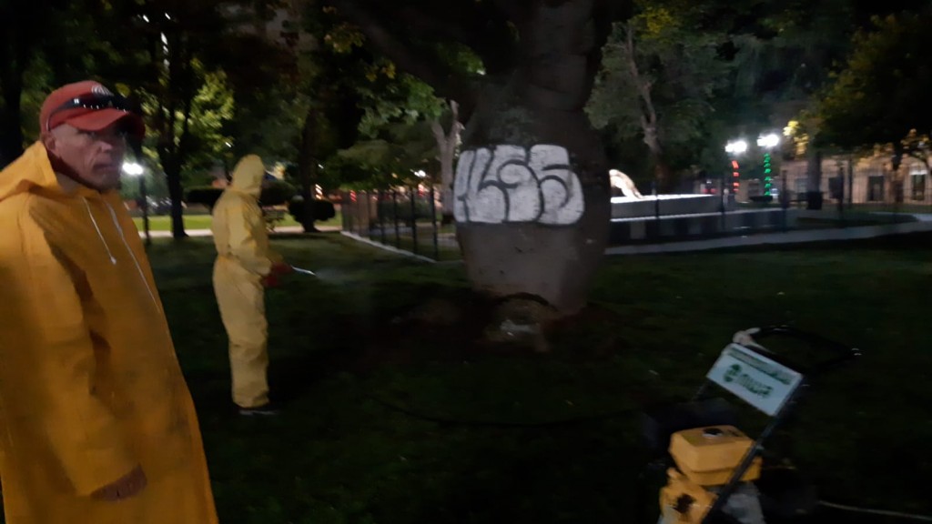 A primera hora de este viernes, personal municipal montó un operativo para retirar el “escrache” con pintura látex y sintética en uno de los ejemplares de la plaza Eduardo Costa.