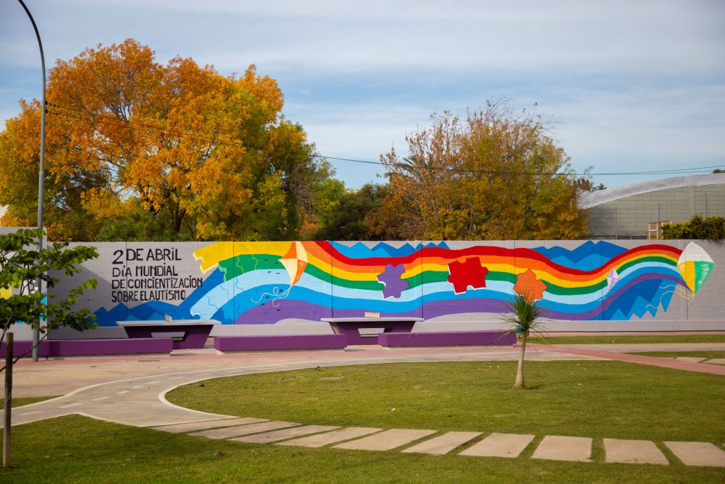 El mural se diseñó a partir de la premisa que el Autismo es tan variable como el espectro de arco iris y fue plasmado por la artista Paola Meoniz con la colaboración de los cooperativistas del Municipio.