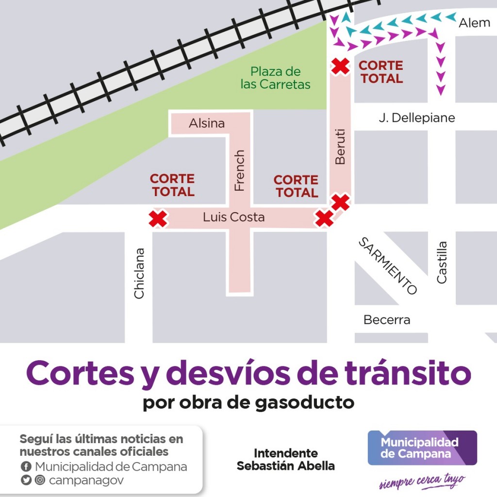 De esta manera, según se informó, a partir de la mañana del lunes habrá cortes totales en la calle Luis Costa, entre Chiclana y Beruti; y en la calle Beruti, entre Luis Costa y Alem.