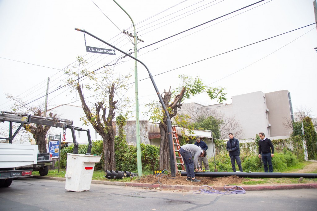 Personal del área de Electromecánica colocó una nueva columna ya que la anterior había sido dañada por la caída de un árbol durante una tormenta. El intendente Abella supervisó los trabajos.