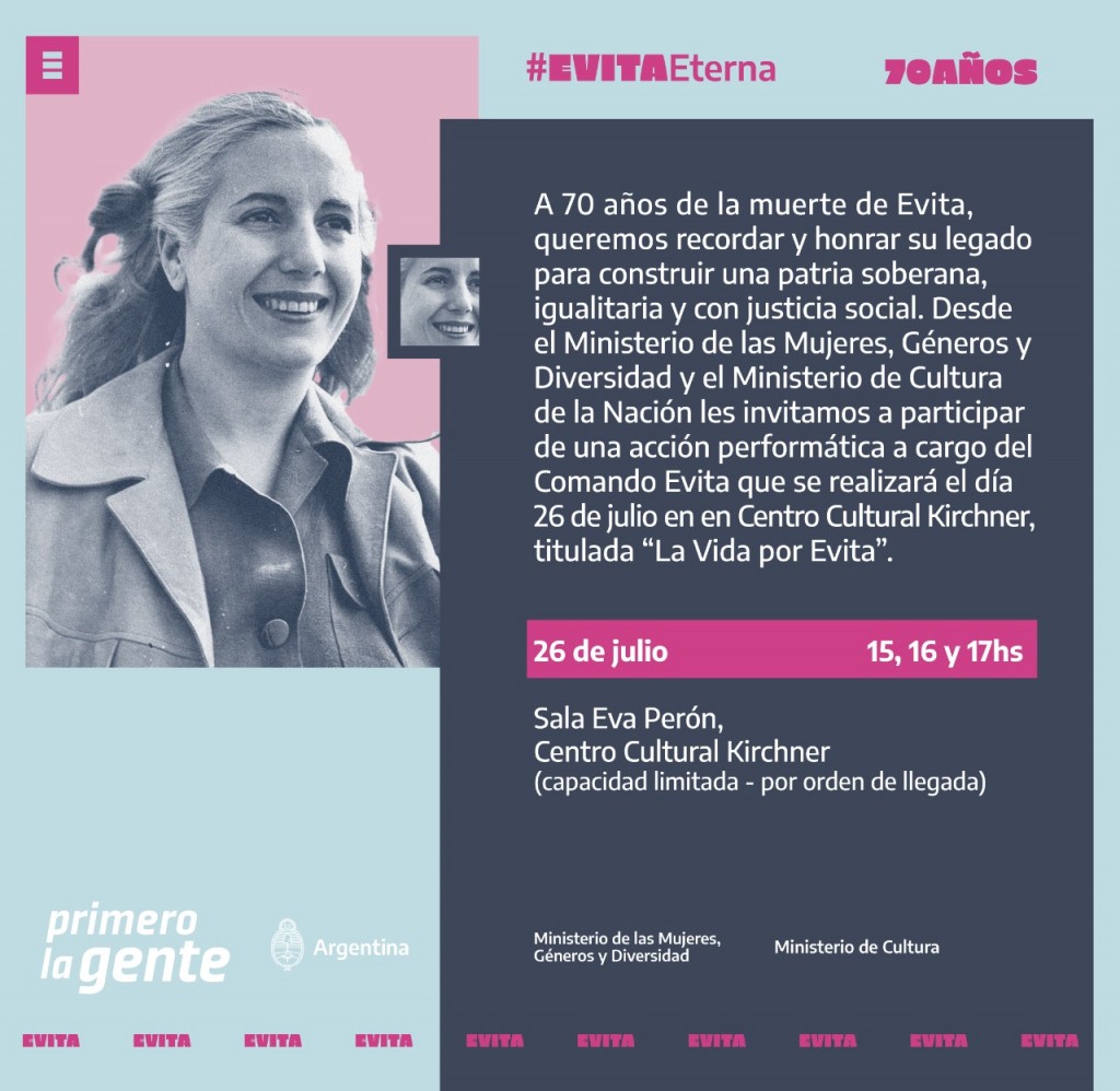 Con motivo de cumplirse el 70 aniversario del fallecimiento de María Eva Duarte de Perón, el ministerio de las Mujeres, Géneros y Diversidad (MMGyD) organiza en conjunto con el ministerio de Cultura de la Nación, el Museo Evita y el Centro Cultural Kirchner, una serie homenajes para recordar el legado político y cultural de una de las mujeres más importantes y transformadoras de la historia de nuestro país. En este marco y durante toda la semana, el espacio del MMGyD en Tecnópolis se convertirá en uno de los principales puntos de referencia de homenaje a la figura de Evita.