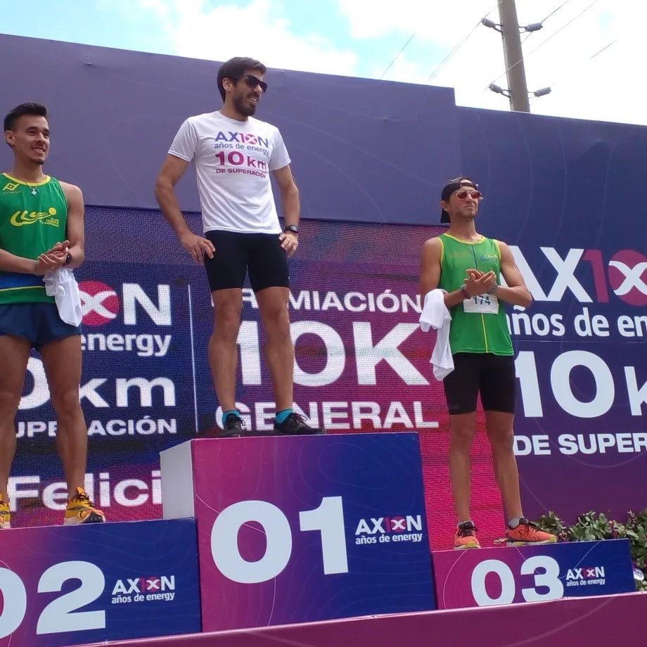 10 años de energía 10 km de superación 10° Aniversario AXION ENERGY ganadores de los 10 km podio de los ganadores 10 km: Damas 40'02" Silvana Hernández de Campana y en Caballeros 32'14" Santiago Escobar de Pilar.