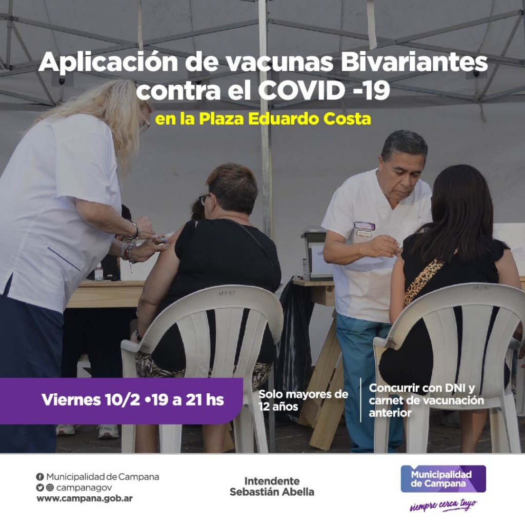 La Secretaría de Salud del Municipio realizará este viernes 10 de febrero, de 19 a 21, en la Plaza Eduardo Costa un operativo de vacunación contra el Covid-19 destinado únicamente a personas mayores de 12 años.
