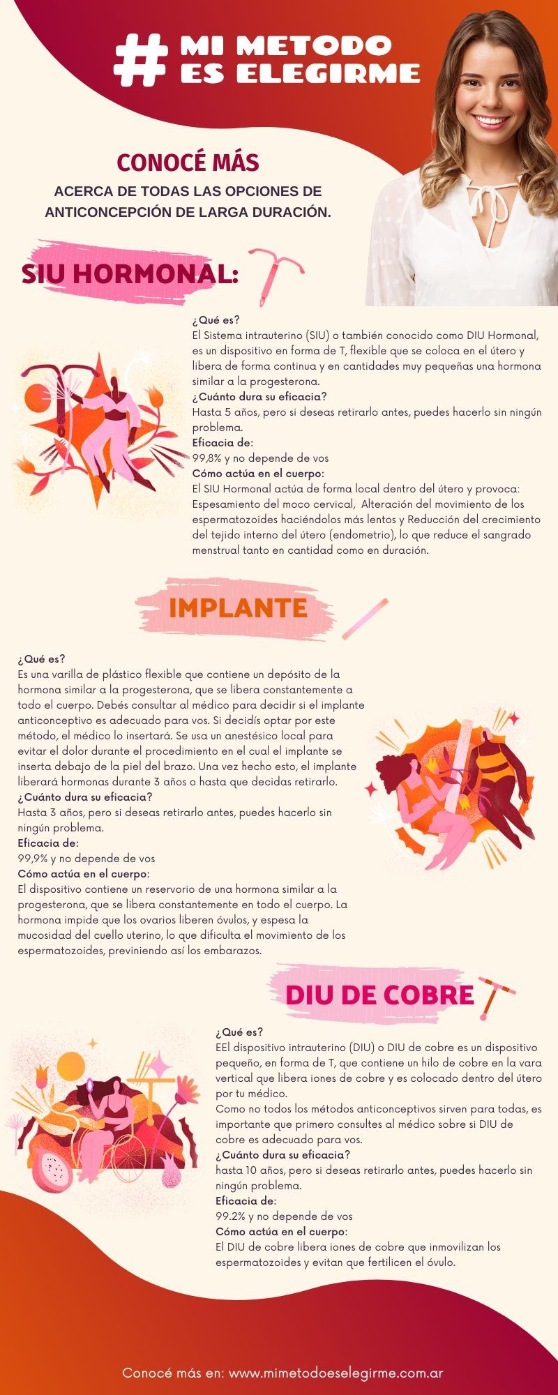 • El SIU Hormonal, el DIU de Cobre y el Implante subdérmico son los 3 métodos anticonceptivos que se consideran de larga duración, ya que su efectividad dura más de un año y como no dependen de la memoria, ni de un compromiso diario son aún más efectivos que los otros métodos anticonceptivos. Estos métodos deben colocarse bajo la indicación del médico. En el caso del SIU Hormonal y el DIU de Cobre, el médico lo coloca dentro del útero (por esta razón se llaman intrauterinos) y, en el caso del implante, se inserta de forma subdérmica en el brazo durante la consulta al profesional.