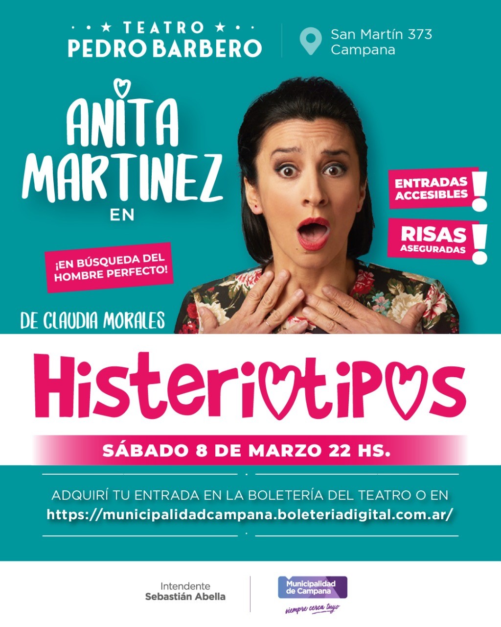 Con su obra “Histeriotipos”, la reconocida actriz Anita Martínez se presentará el próximo sábado 8 de marzo, a las 22, en el Teatro Pedro Barbero.