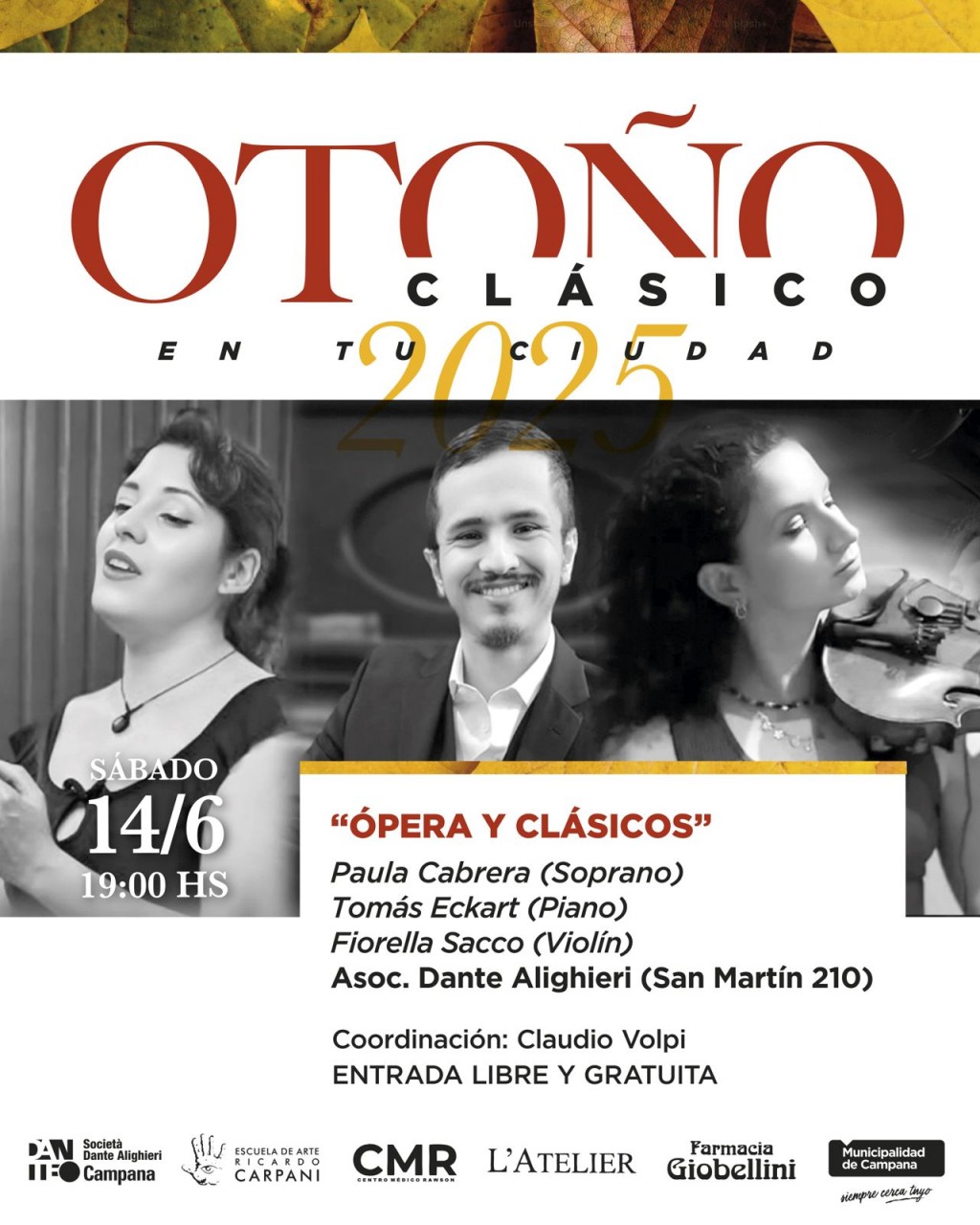 Bajo el nombre de “Ópera y Clásicos” y con entrada libre y gratuita, este sábado 14 a las 19, en la Asociación Dante Alighieri (San Martín 210) se llevará a cabo el último concierto de “Otoño Clásico 2025”.