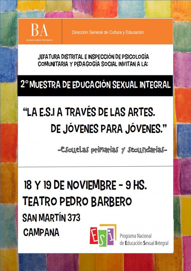 La inspectora Jefa Distrital de Campana, Lic. Gladys Dalprá junto con el Equipo de Inspectores y los Equipos de Orientación Escolar de la Modalidad de Psicología Comunitaria y Pedagogía Social, invitan a la Muestra Distrital, estática y dinámica de Educación Sexual Integral: "La E.S.I a través de las artes. De Jóvenes para Jóvenes"