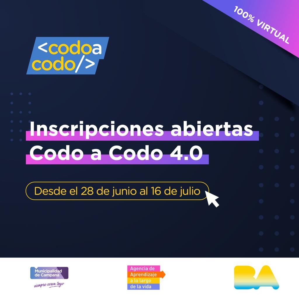 La Secretaría de Desarrollo Social, Educación y Cultura y la Subsecretaría de Modernización del Municipio, en conjunto con el Ministerio de Educación de la Ciudad de Buenos Aires, informan que continúa abierta la inscripción al programa "Codo a Codo 4.0".
