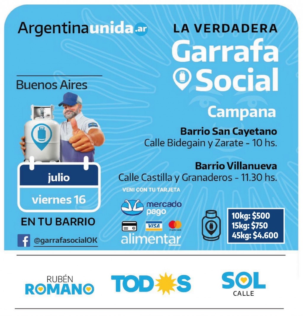 Los vecinos podrán adquirir garrafas de 10 kilos (por $500), de 15 kilos ($750) o 45 kilos ($4600). Además, podrá abonarse con Mercado Pago, tarjetas de crédito o débito, y tarjeta Alimentar.