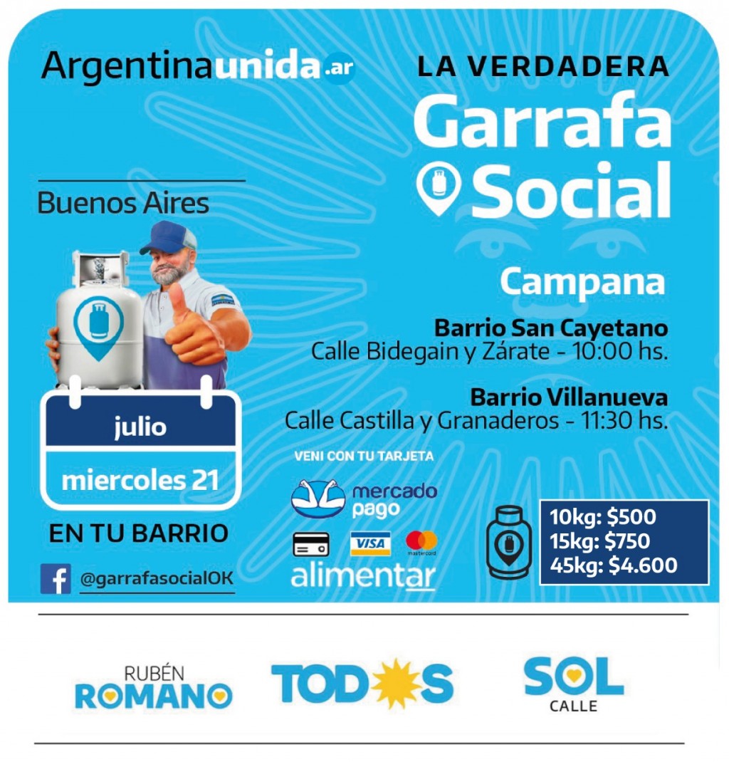 Los vecinos podrán adquirir garrafas de 10 kilos (por $500), de 15 kilos ($750) o 45 kilos ($4600). Además, podrá abonarse con Mercado Pago, tarjetas de crédito o débito, y tarjeta Alimentar.