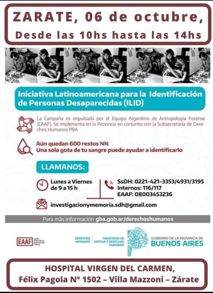 El próximo miércoles 6 de Octubre de 10 hs a 14 hs, la Subsecretaría de Derechos Humanos de la Provincia de Buenos Aires(SSDDHH) y el Equipo Argentino de Antropología Forense (EAAF) recibirán, en el marco de la Campaña “Iniciativa Latinoamericana para la Identificación de Personas Desaparecidas” (ILID), a familiares de personas detenidas – desaparecidas entre los años 1974 y 1983. El encuentro se realizará en el Hospital “Virgen del Carmen” de la ciudad de Zárate, en calle Félix Pagola 1502 (Villa Mazzoni).